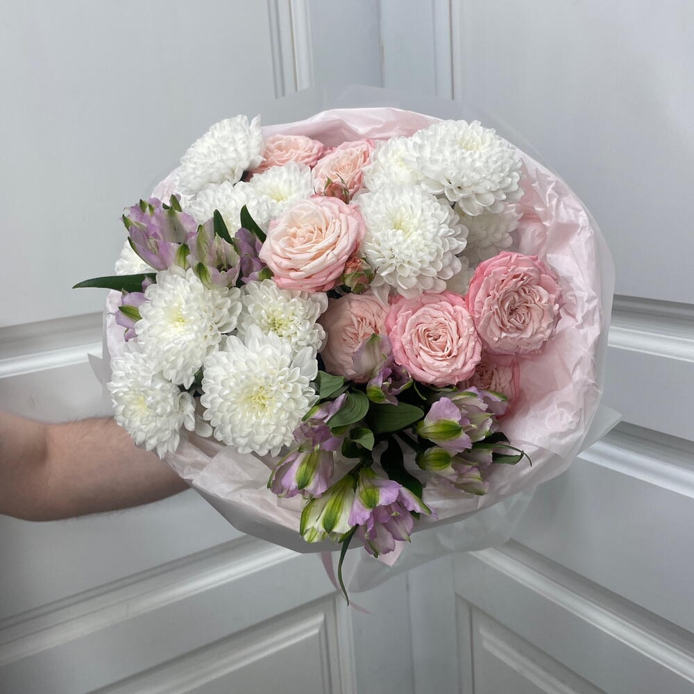 Авторский букет из альстромерии,пионовидной розы и хризантемы