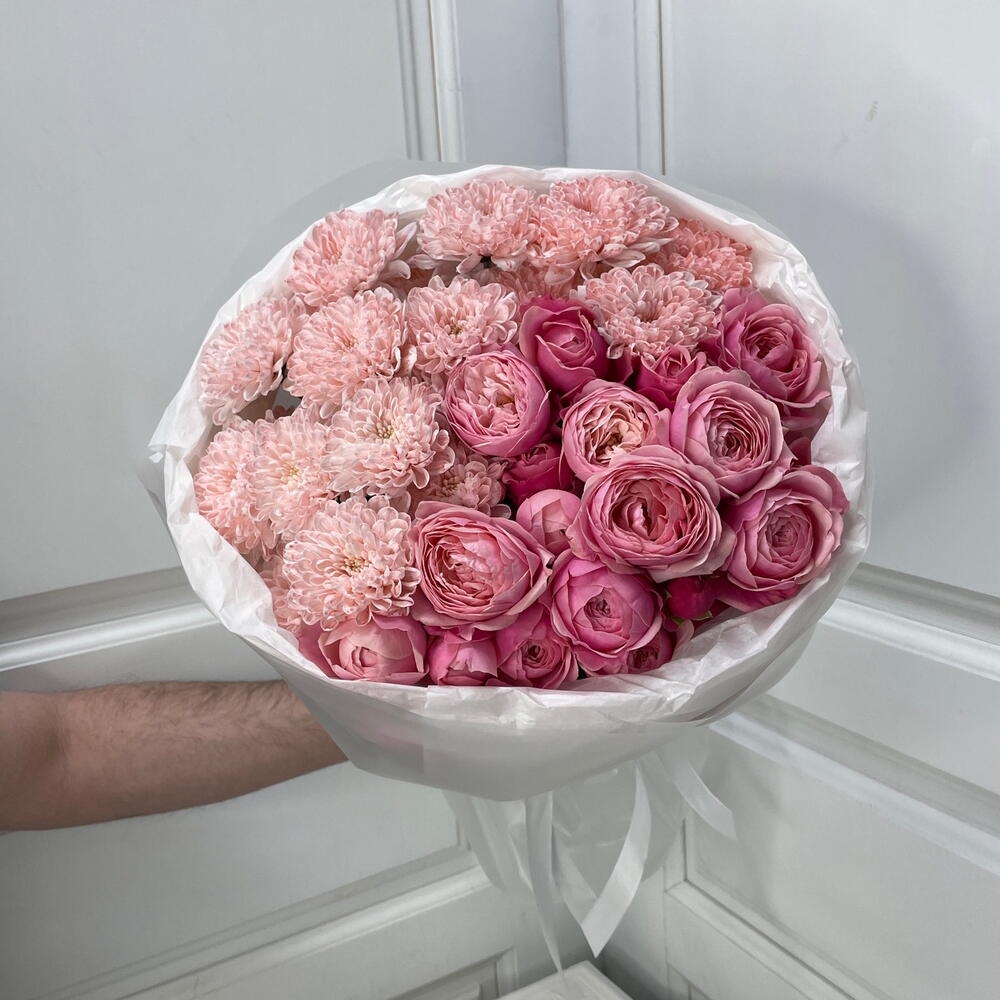 Авторский букет из нежных Пионовидных роз и хризантемы