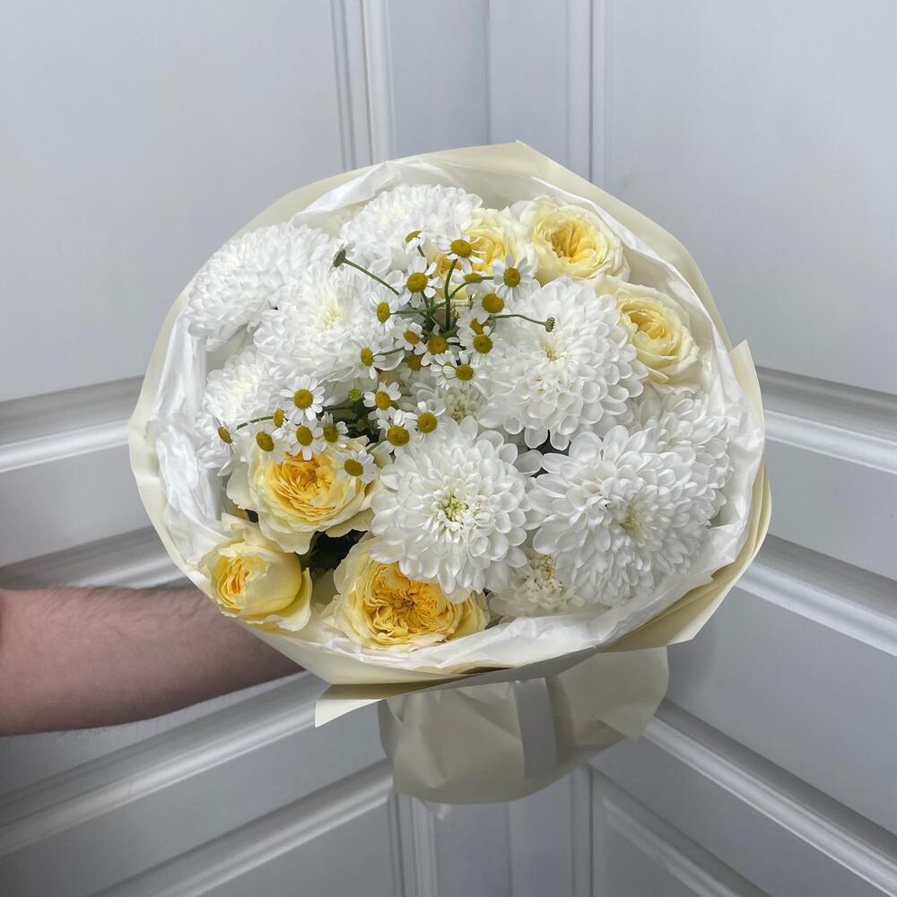 Авторский букет из пионовидных роз,танацетума и хризантемы